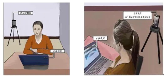 作为副摄像位的手机在考试进行期间,应保持充电状态,手机副摄像头摆放位置示意图(副摄像头放置在考生右后方或左后方45度角左右,确保监控范围覆盖考试设备的显示屏幕和考生本人头部、背部、手部):