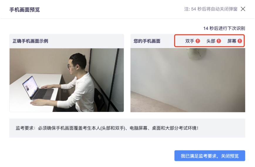 模拟测试主要目的是测试设备能否满足考试需求,熟悉考试系统操作流程,所有考生须在规定时间内完成考场布设及摄像机位的摆设,并登录考试系统完成考试设备、摄像设备调试、身份信息确认(登录系统后需要通过人脸识别,切勿过度化妆或美颜)等。因未参加模拟测试,不熟悉系统操作、未调试好相关设备,导致正式考试无法正常进行的,后果由考生自行承担。